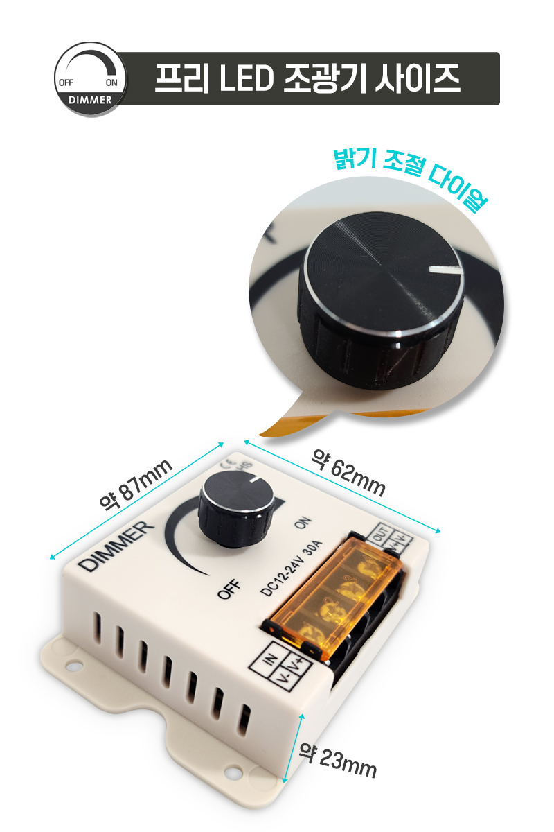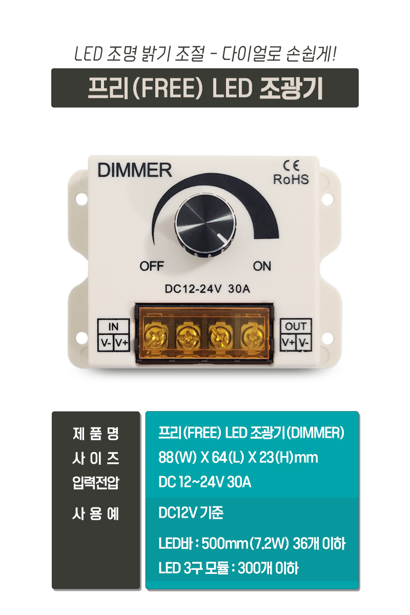 프리 조광기는 DC 12~24V 전압을 사용하는 LED바 또는 3구 LED모듈에 연결해서 빛밝기조절이 가능...